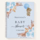 For an elegant and modern baby shower. A light blue background. Decorated with light blue, florals, pampas grass and a teddy bear holding a balloon.