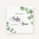 A white background colour. Decorated with elegant eucalyptus greenery sprigs. Add a name and a date.