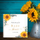 A white background colour. Decorated with sunflowers, eucalyptus greenery and golden foliage. Add a name and a date.