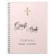 A blush, rose gold background colour, decorated with a golden cross. Add a name and a date. The text: Guest Book is written with a modern hand lettered style script.