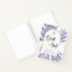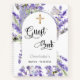 A stylish white background decorated with an arch frame of violet lavender florals and a golden cross. Personalise and add a name and a title/event. Guest Book is written with a stylish hand letted script.