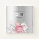 A faux silver looking background with pink and white florals, silver foliage and a golden cross. Personalise and add a name, and date.