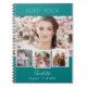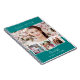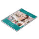 Create your own unique photo collage. Use four, 4 of your favourite photo. Personalise and a name and age/dates. A teal, green background colour, white text.