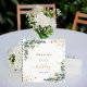 A white background color. Decorated with eucalyptus greenery, golden foliage and faux gold glitter dust. Add a name, age and a date.