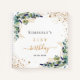 A white background colour. Decorated with eucalyptus greenery, golden foliage and faux gold glitter dust. Add a name, age and a date.