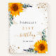 A white background colour. Decorated with sunflowers, eucalyptus greenery, golden foliage and faux gold glitter dust. Add a name, age and a date.
