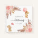 A white background. Decorated with rose gold, blush pink florals, pampas grass and two teddy bears.