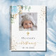 For an elegant christening. A chic white background, decorated with a light blue rose, eucalyptus greenery, faux gold glitter dust and a golden cross. Personalise and add a square sized photo on the front, the name of the child and the date of the christening. Black and golden letters.