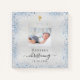 A faux silver metallic looking background, decorated with blue faux glitter dust and a golden cross. Personalise and add a square sized photo on the front, the name of the child and the date of the baptism.