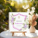 A white background. Decorated with a pink crest, pink and purple flowers, florals. With a golden cross.