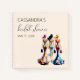 Modern and stylish Bridal Shower Guest Book featuring watercolor painting of three elegant, hourglass-shaped women wearing form-fitting and lightweight dresses of vibrant colours and patterns. Their hair styles and colour palettes differ and each carries a small backpack, adding a touch of casual charm to the scene.