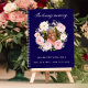 A guest book for a memorial service or funeral. A classic dark blue background, decorated with a pink and white floral wreath. Personalise and add a photo, name and dates.