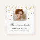 A stylish white background with golden hearts. With the text: Forever in our hearts, written with an elegant hand lettered style script. Add a name and dates, a photo.