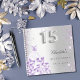 A faux silver metallic looking background decorated with purple, violet faux glitter dust and a dress. Personalise and add a name and date. Number 15 is written with a balloon style script.