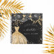 For a Sweet 16, 16th birthday party. A black background with faux gold glitter dust, a golden dress and black roses, florals. The name is written with a modern hand lettered style script. Personalise and add a name and date.