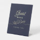 Elegant simple modern minimalist gold and navy blue wedding Guest Book tabletop sign with unique hand drawn couple love birds and handwritten calligraphy script.