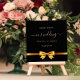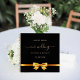 A stylish black background with a golden ribbon and bow. Personalise and add your names and wedding date.