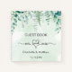 A green watercolored background. Decorated with watercolored eucalyptus greenery, woodland ferns. Mr and Mrs with a heart. Add your names, the wedding date.