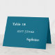 Guest Name Meal Choice Turquoise Blue Place Card featuring stylish white text on a turquoise blue background. Please use the online personalisation template to personalise each place card individually before adding the card to the cart, to show the table number for the particular table where the guest is to be sitting, the name of the guest and the meal choice (or dietary restriction) for the guest. (Repeat the personalisation process for each card you wish to purchase, adding the card to the cart individually each time). This printed place card will arrive flat and so will need folding in half before use. (The size before folding is approximately 5" height by 3.5" width, intended to be folded so approximately 2.5" by 3.5" after folding). Once the printed card is folded, the same wording will show on both sides (so as to be visible from both sides of a table). A neatly-personalised place card for a stylish wedding or other special occasion.