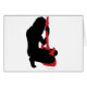 Silhouette of a girl with a guitar. Girl is in black and guitar is in red.