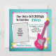 This cute little girl's birthday invitation features a rockstar theme. The background is teal blue stripes and is accented with a pink guitar on the right side. A photo frame allows you to add your favourite photo of the birthday girl and customisable text allows you to add all the party details. This invitation is for a child turning two birthday but can be customise for a one, three, four year old or more.