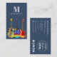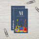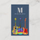 Modern Guitar teacher social media business card with custom logo template and contact social media icon and details perfect for business networking. Psychedelic acoustic guitar, semi acoustic guitar and electric guitar in bright colours on a blue background complete with personalised monogram, name, details and your logo. Cool modern musicians business card design for guitarists, professional musicians, entertainers and music teachers. Original artwork by artist Catherine Sweetman