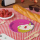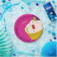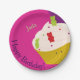 Paper plate with a smiling gummy bear cupcake. This design has a pink and purple background. This item shows the words Happy Birthday and a customisable name.