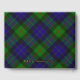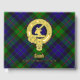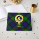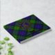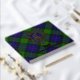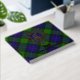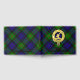 Clan Gunn crest badge surrounded by a strap and buckle over tartan background. Custom front, back and spine text.