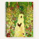 Notebook featuring Gustav Klimt’s oil painting Garden with Roosters (1917). Two brown chickens stand on a garden path. Beautiful pink, red, and white flowers bloom along the path. A great gift for fans of Art Nouveau and Austrian art.