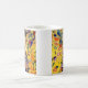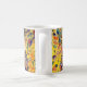 Coffee Mug featuring Gustav Klimt’s oil painting Lady with Fan (1918). A woman wearing a blue kimono holds a red fan against a colourful yellow background of flowers and peacocks. A great gift for fans of Japonisme and European art.