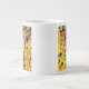 Coffee Mug featuring Gustav Klimt’s oil painting Lady with Fan (1918). A woman wearing a blue kimono holds a red fan against a colourful yellow background of flowers and peacocks. A great gift for fans of Japonisme and European art.