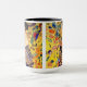 Coffee Mug featuring Gustav Klimt’s oil painting Lady with Fan (1918). A woman wearing a blue kimono holds a red fan against a colourful yellow background of flowers and peacocks. A great gift for fans of Japonisme and European art.
