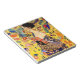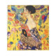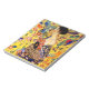 Notepad featuring Gustav Klimt’s oil painting Lady with Fan (1918). A woman wearing a blue kimono holds a red fan against a colourful yellow background of flowers and peacocks. A great gift for fans of Japonisme and European art.