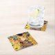 Paper Coasters featuring Gustav Klimt’s oil painting Lady with Fan (1918). A woman wearing a blue kimono holds a red fan against a colourful yellow background of flowers and peacocks. A great gift for fans of Japonisme and European art.