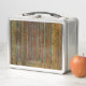This is a standard metal lunchbox that appears to work just fine. We designed this box ourselves with an uploaded photo and custom text on the front and back. It looks absolutely beautiful except the front of the lunchbox is not centered like it shows in the photo. The print borders don't align with the inset flat part of the box where the preview photo online showed it perfectly centered in there. The back looks nice and centered though.