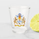 This shot glass shows the Guyana Coat of Arms, which includes the Amerindian head-dress, two jaguars holding a pickaxe, sugar cane, and a stalk of rice, a shield adorned with the Victoria Regia lily, and the national bird, the Canje Pheasant.