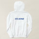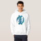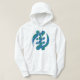 African "Gye Nyame" (God is Sufficient) Adinkra symbol in blue green comb kente pattern centred on the front of a white hoodie with front pocket. The words "Gye Nyame" are printed on the back. This bright eye catching look makes a God respecting statement. Sure to be a conversation starter! - Our store patterns: K16 and GyeNyame