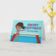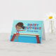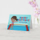 This cute custom African American girls gymnastics birthday card features a pretty black gymnast girl standing in front of a beam. She is wearing a red leotard and smiling to next to her beautiful blue monogram.
