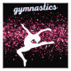 This girls gymnastics design has a solid black background with pink specs of faux glitter and a gymnast silhouette leaping into the air.