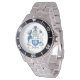 Has heft and feel of expensive stainless steel quartz watches. Good band with safety catch. I removed links, which is easy because engraved arrows show direction to push the linking pins. As always by this seller, the image (a railroad logo) is a perfect reproduction of my emailed image, and is precisely spaced and aligned.