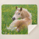 A cute Haflinger foal lies in a green flowering meadow with many yellow buttercups flowers. The chestnut horse breed with a blonde flaxen mane also called avelignese or haffies. A cute and enchanting filly photo taken by Katho Menden. This sherpa blanket is a gift idea for animal and horse lovers. http://www.zazzle.com/kathom_photo -
