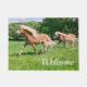 Haflinger mare with frisky foals running together across a pasture in a beautifull landscape. A blond flaxen chestnut horse breed, also called haffies or avelignese, photo taken by Katho Menden. This photo printing door mat Welcome is a gift idea for horse lovers