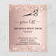 A rose gold gradient background, with glitter, sparkles and a black scissors. On front: The text: Price list. Personalise and add your name and address.