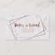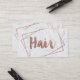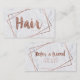 A modern, stylish hair stylist referral business card with modern hand lettering style brush typography in faux rose gold foil on a trendy and elegant white marble background with frame geometric border. If you need any customisation, don't hesitate in contacting me