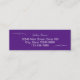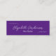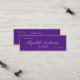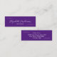 This royal purple and white mini business card has a line of white handwritten-style script for your name on the front. Additional text for your title is available below the script. The back also has four lines of display text for your salon name, address, and phone number. All text can be edited or deleted.