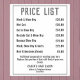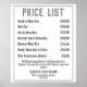 Large Price-list Poster for a Hairdresser, Hair Stylist, or Hair Salon. Hairdresser poster, Hair Stylist poster, or Hair Salon Poster. Alter prices as you wish. Displays up to 7 items and prices plus contact information. Big price list. Black and white.