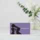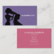 A hairdresser business card featuring silhouette of a hairdresser with scissors cutting hair over a purple background. The back comes with full contact information on a pink background.
