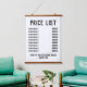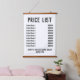 Wall Hanging price-list for a hairdressing salon or hair stylist. Alter prices as you wish. Displays up to 9 items and prices. Black and white. White background.