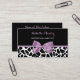 A cute black and white giraffe print hair salon business card for the professional hair stylist, with a girly lavender purple ribbon tied into a feminine bow. Personalise this pretty animal print design by adding the name of the hairstylist or hairdresser. Flat printed image, not actual bow.