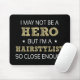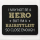 I may not be a hero, but I'm a Hairstylist so close enough humourous word art in sans-serif and doodle cross-hatch font lettering in white and golden yellow.